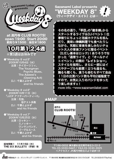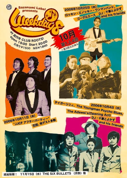 サザナミレーベルでは、9月から大好評のウィークリーイベント「Weekday8」を開催しております。毎週水曜日、午後8時より、高円寺はCLUB ROOTSにて開催しております!今回はその10月分のラインナップが揃いましたので、お知らせいたします。みなさまお気軽にお越しくださいませ!