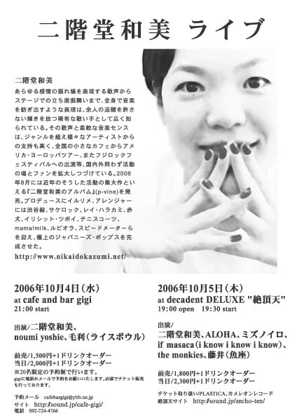 10/5(木) @decadent DELUXE 19:00 open 19:30 start 前売り 1800円 当日 2300円 1ドリンクオーダー 出演 二階堂和美、ALOHA、ミズノイロ、if masaca(i know i know i know)、the monkies、藤井(魚座) チケット取り扱い/PLASTICA、カメレオンレコード 絶頂天サイト http://sound.jp/zecho-ten/