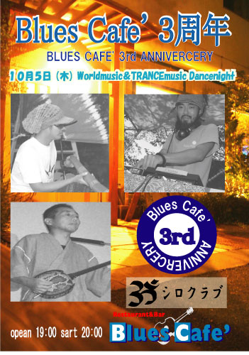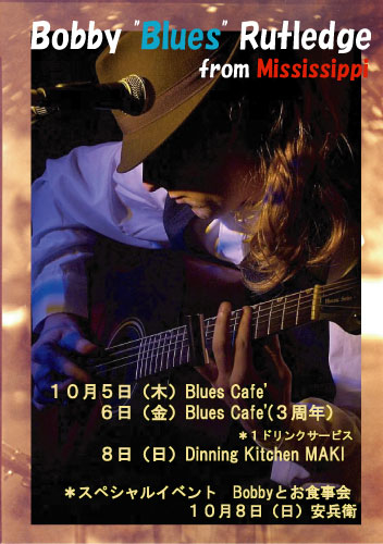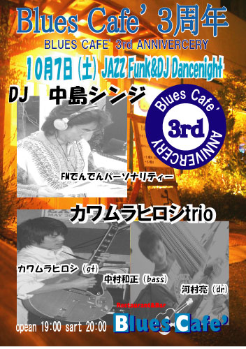 皆さんの募金によりミシシッピーからブルースマン ボビー来日!! 10/04 Wed ボビー来日、ブルースカフェ前夜祭 10/05 Thu BluesCafe三周年 民族ライブ ・DJ go ・ディジュリジュ 中村武文 ジャンベ各自持参 セッション 10/06 Fri BluesCafe三周年 2年間の募金でいよいよ、ブルースマン来日!! ミシシッピーブルース ボビー&ジプシーライブ 10/07 Sat BluesCafe三周年 JAZZファンクライブ&DJ中島シンジ ダンスナイト バンド名 カワムラヒロシtrio メンバー カワムラヒロシ(gt) 中村和正(bass) 河