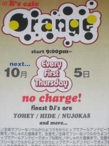 ◆Orange 2006.10.5(thu) @岐阜B's Cafe:058-263-3692 start 9pm〜mid no charge★ ‐DJ's‐ YOHEY、hide、NUJOKAS ※前回のSpecialも大盛り上がりでした!! 今回は久しぶりにゲストなしでやります。 お時間ある方は遊びに来て下さい!!! 秋の夜長を楽しみましょう★
