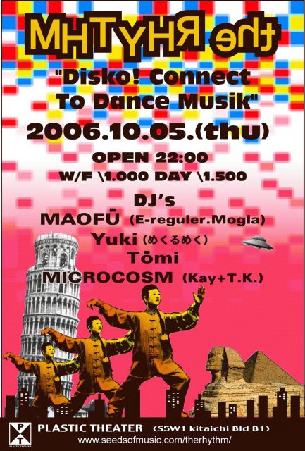 【 the RHYTHM #5 】 - Disko! Connect To Dance Musik - ●2006.10.5.(thu) ●OPEN 22:00 ●W/F \1.000 DAY \1.500 @Plastic Theater(札幌市中央区南5西1北一ビル地下1階) < DJ'S > ・Mao-Fu (E-reguler,Mogla) ・Yuki (めくるめく) ・To-mi ・MICROCOSM (Kay + T.K.) 【The Rhythm】HP http://www.seedsofmusic.com/therhythm/