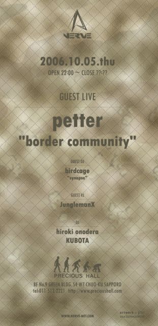 2006/10.05.thu @ PRECIOUS HALL GUEST LIVE petter "border community" GUEST DJ birdcage "synapse" GUEST VJ JunglemanX DJ hiroki onodera KUBOTA ADV.2500 W/F3000 DOOR3500 Petter "border community" James Holden, Nathan Fakeに次ぐBorder Community第三の男、スウェーデン出身のプロデューサーKarl Petter Nordkvist。 イギリスの奇才James Holdenによる "Balance005" や、'03年若干18歳でDeep Focusからリリースした "These Days" は大御所Sasha、Luke Chableがremixをてがけ着々と知名度を広