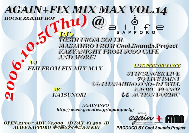 AGAIN vol.14 @alife 南4西6タイキビル地下1 今回は(多分) DJ陣はおなじみのメンバーです。 ___PERFORMANCE&LIVE___ SINGER LIVE___STTF FROM SHINPEI&TOSHIYA でかなりプロ志向の SHINPEI&SATOSHI が前回同様参加します。 女性ダンサー3人引き連れての参加?です。 LIVE_____もも、MASAHIRO、DJ WILL http://mixi.jp/show_friend.pl?id=2370834 http://mixi.jp/show_friend.pl?id=556307 http://mixi.jp/show_friend.pl?id=387028 いつもアゲインに来ていただいているももちゃんとMASAHIRO,DJ WILL FRO