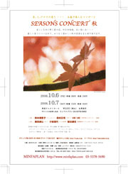 都会のオアシスとマスコミでも話題のSEASONS CONCERT に藤原道山が出演。ふるさと、赤とんぼなど、懐かしい名曲から、オリジナル曲まで、演奏します。 音、光、アロマの香り・・・五感で楽しむコンサート 五感で楽しむSEASONS CONCERT at 原宿クエストホール 美しい月夜に輝く萩の花、彩る街路樹、淡い想い出・・・ 優しい香りにつつまれて、せつなく懐かしい秋の情景を音と詩で奏でます。 2006年10月6日(FRI) 開場 18:00 開演 19:00 2006年10月7日(SAT) 開場 15:00 開演 16:00 【会場】原宿クエストホール 出演: 【一