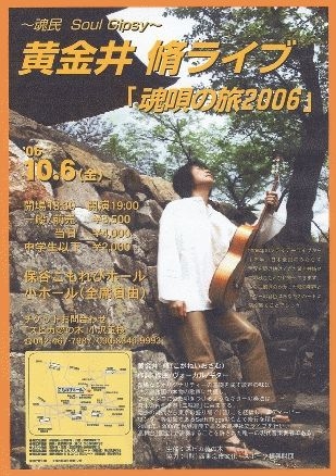 僭越ながら、お知らせさせていただきます。 管理人様、不都合がございましたら削除ねがいます。 どうぞよろしくお願いします。 一般前売 \3,500 一般当日 \4,000 中学生以下 \2,000 全席自由 8月11日(金)チケット発売開始!! 保谷こもれびホール http://www.nishitokyo.or.jp/komorebi/access/index.html 2005年のフライデーライブから1年半、 日本全国のみならず世界を駆け抜けてきた黄金井脩が この秋こもれびに帰ってきます。 さらに磨きのかかった魂の唄声とギターの音色は あなたのハートに深く響くことでしょう。