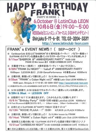 *FRANK'S BIRTHDAY PARTY* 10月6日(金) @新宿 LEON 19:00〜 2,000円(1ドリンク付) フランクのバースデーパーティです。 みんなでお祝いに行きませんか? (^▼^)♪ ・パフォーマンスあります☆