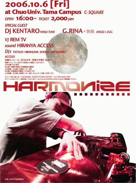 管理人様、告知失礼いたします 中央大学 八王子キャンパス内でのイベントです。中大だけのイベントにしたくないので、興味がある方は気軽に連絡ください 【HARMONIZE】 2006.10.6 [FRI] @Chuo Univ. C-square OPEN:16:00 \2000 〜SPECIAL GUEST〜 DJ KENTARO http://mixi.jp/view_community.pl?id=19049 G.RINA + 鉄鍋 http://mixi.jp/view_community.pl?id=42902 -VJ- REM TV ※当日会場までのアクセスや細かい情報は下記のBLOGにて確認下さい。 http://onkan.exblog.jp/ ※