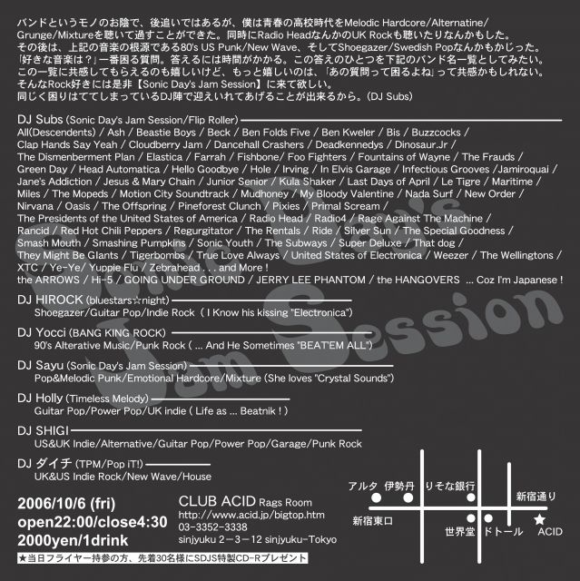 僕らの新しいロックDJイベント開催決定☆ 【Sonic Day's Jam Session Vol.1】 2006年10月6日(金)@新宿club ACID http://www.acid.jp/bigtop.htm open22:00/close4:30 2000yen/1drink DJs Subs (Sonic Day's Jam Session / Frip-Roller) HiROCK (bluestars★night) Yocci (BANG KING ROCK) Sayu (Sonic Day's Jam Session) Holly (Timeless Melody) Shigi ダイチ (TPM/Pop iT!) ★当日フライヤー持参の方、 先着30名様にSDJS特製CD-Rプレゼント! ※各DJの紹介なども[イベント]のフライヤー裏面
