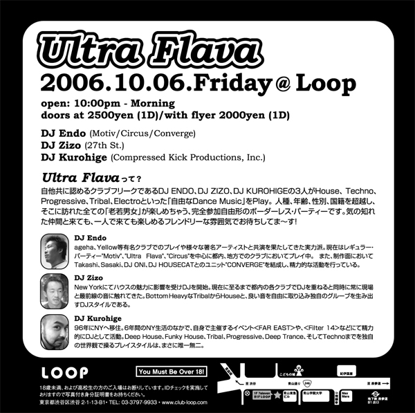 2ヶ月ぶりの開催となりますが、 前回から随分と時が経ってしまった様な気がするのは 私だけでしょうか? いつも通りDopeなHouse Musicと楽しい雰囲気で 皆様のお越しをお待ち申し上げております。 皆様お誘いあわせの上、 是非是非遊びにいらしてください。 *¥1,500/ 1dのディスカウント枠ございます。 ご希望の方はお名前、人数をご記入の上、 メッセージください。 DJ KUROHIGE a.k.a. Taka ULTRA FLAVA 2006.10.6 Friday @ Loop OPEN: 10:00pm〜Morning DOOR: 2500Yen(1D) AT DOOR, 2000Yen (1D) WITH FLYER 東京都