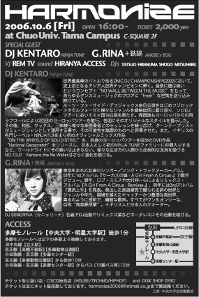 管理人様、告知失礼いたします。 中央大学 八王子キャンパス内でのイベントです。興味がある方は気軽に連絡ください。 【HARMONIZE】 2006.10.6 [FRI] @Chuo Univ. C-square OPEN:16:00 \2000 〜SPECIAL GUEST〜 DJ KENTARO http://mixi.jp/view_community.pl?id=19049 G.RINA + 鉄鍋 http://mixi.jp/view_community.pl?id=42902 -VJ- REM TV -SOUND- HIRANYA ACCESS ※チケットの購入方法や当日会場までのアクセスや細かい情報は下記のBLOGにて確認下さい。 http://