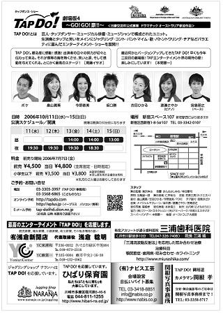 コミュニティTOPページには 掲載して頂いてますが、改めてご案内いたします。 『TAP DO!劇場版4 GO!GO!豪!!』 10月11日(水)〜15日(日) 新宿SPACE107にて 【キャスト】 ポケ・畠山眞葵・今野直美・吉田ひかる・坂口勝 渡邊さやか(ピアノ)・宮島朋之(ベース) 【TAP DO!とは】 芸人・タップダンサー・ミュージカル俳優・ ミュージシャンで構成されたユニット。 笑いとタップと生演奏をメインにジャグリング・コント・パントマイム 歌・バトントワリング・チアなどバラエティに富ん