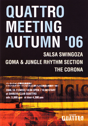 open/start: open 18:00 / start 19:00 ticket: adv.¥3,800(D別) / door.¥4,300 at:渋谷CLUB QUATTRO with: SALSA SWINGOZA 他 ticket info:7/29(土)発売 チケットぴあ 0570-02-9999 ローソンチケット 0570-000-777 CNプレイガイド 0570-8-9999 イープラス eplus.jp エキサイトチケット ticket.excite.co.jp event info: ホットスタッフ・プロモーション TEL 03-5720-9999 クラブクアトロ TEL 03-3477-8750