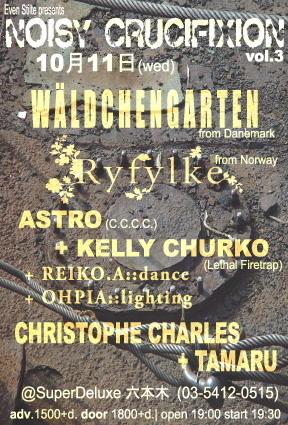 告知させていだたきます。よろしくお願いします。 『Noisy Crucifixion #3』 (presented by Even Stilte) デンマークからノイズジハードの「Wäldchengarten(ヴェルチェンガーテン)」、 そしてノルウェーの「Ryfylke(リフィルケ)」来日! アンビエントミュージック+ドローンミュージックが あなたをフィヨルドの静けさからバイオレンスの渦へと誘います。 10/11(水)open/19:00 start/19:30 adv/1500円 door/1800円 (ドリンク別) @Super Deluxe http://www.super-deluxe.com/ 出演は、 Wäldchen