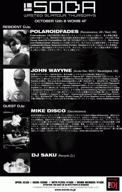 DJ軍はUKよりUK Renaissance , Gatecrasher等のBIG PARTY経歴を持つPolaroidfades、Accute Recordings NYCよりJOHN WAYYNE、そして日本中を飛び回るDJ、DiscoscienceのMike MCKennaとRecycleよりサマーソニックでもDJを勤めたDJ Sakuの豪華四人組によるVIP NIGHT!!