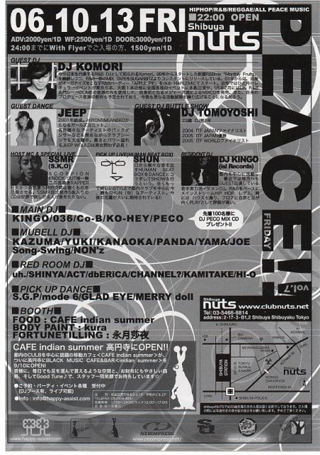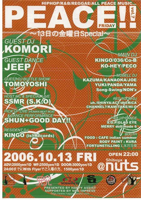 PEACE -FRIDAY- vol.7 [HIPHOP/ R&B/ REGGAE/ ALL PEACE MUSIC] @sibuya nuts GUEST DJ: KOMORI GUEST BATTLE SHOW: TOMOYOSHI RESIDENT DJ: KINGO (is! Records) GUEST DANCE: JEEP PICK UP LIVE(HUMAN BEAT BOX) & DANCE PERFORMANCE: SHUN + GOOD DAY!! HOST MC & SPECIAL LIVE: SSMR (S.K.O) DJ: KINGO/ 036/ Co-B/ KO-HEY/ PECO B1F LOUNGE DJ: KAZUMA/ YUKI/ KANAOKA/ PANDA/ YAMA/ Song-Swing/ JOE/ NON'z B2F LOUNGE DJ: SHINYA/ ACT/ dbERiCA/ CHANNEL?/ UH/ KAMITAKE/ HI-O and more PICK UP DANCE: S.G.P/ mod