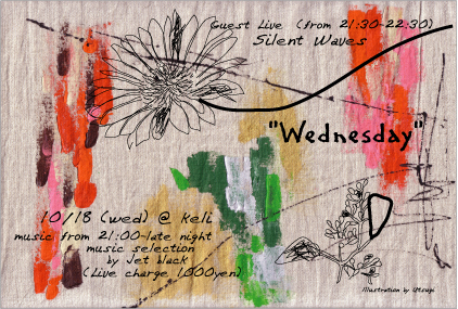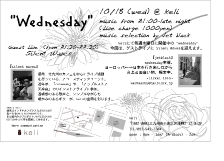 10/18 (水) "Wednesday" 21:00 - Last (live charge 1000yen) Guest live silent Waves (21:30-22:30) music by Jet black (21:00 - late night) ライブ終了後は、入場無料となります。 『silent Waves』 福岡・北九州のカフェを中心に ライブ活動を行っている、アコースティックユニット。 近年は、「cafeweek」や「アップルストア天神店」 でのインストアライブに参加。 http://mixi.jp/view_community.pl?id=60598 @keli http://mixi.jp/view_community.pl?id=629249
