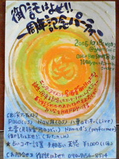 告知、失礼させていただきます。 親不孝通りのモスから左に折れて約100M先右手にあるエンターテイメント居酒屋「御託はよせ!!」が10月18日をもって一周年を迎えることになりました! その日を記念してパーティーを開くことになりました☆ 八重山モンキーも出演します☆是非、遊びにいらして下さい☆ ━─━─━─━─━─━─━─━─━─━─━─━─━ 2006/10/18[WED] @glam cafe open20:00 start20:30 1000yen[1drink order] 問い合わせ先 「御託はよせ!!」 090-7156-8514 ━─━─━─