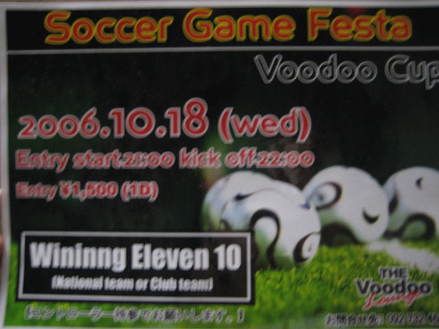Sooccer Game Festa Voodoo Cup 10月18日@Voodoo Lounge Entry¥1500(1drink order) Winning Eleven 10を使用して親富考道りNo.1を決める大会です。過去6回ほど開催しました。なおこの大会には、親富考通りを代表するDJ陣など多数の人々が参加する予定です。 また、優勝者には賞品も用意しています。 EntryはVoodoo、QUEEN`S SOUNDなどにエントリーシートを用意しています。当日参加でもOKです。もちろんMIXI上でもできます。 エントリーを希望している方は自分宛にメッセージで、お名前、電話番号、メールアドレスの書き込みをお願