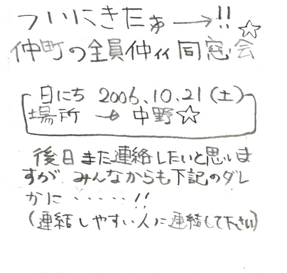 つぃにきたぁ→→→!!(PД`q。) 仲町の全員仲ィィ同窓会☆ ひにち:2006.10.21(ど) ばしょ:なかの? 転校しちゃった人にもできる限り連絡します。 引越ししちゃった人の連絡先がわかれば是非教えてください。 転校しちゃったご本人からのお問い合わせもお待ちしてます。 名前を教えていただければ覚えている自信あるのでお気軽にどうぞ。 後日、ハガキor電話で連絡をまゎすけど、 コレ見たら連絡くれると嬉しいです(y≧▽≦)y♪ 連絡ゎ下記の誰かのケータイがわかる人は直接ケータイへ。 わからない人はmixiに書