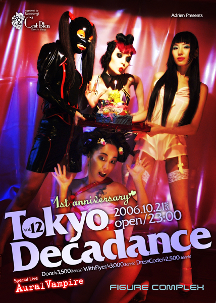 ‥…・・・・★Tokyo Decadance 1th Happy Birthday !!!★・・・・…‥ 日時:2006.10.21(Sat) OPEN pm.23:00 to am.6:00まで 場所:FIGURE COMPLEX 住所:東京都港区西麻布1-14-2 疋田ビルB2F 電話:03-5786-4525 HP : http://www.figurecomplex.com/ 地図:http://www.figurecomplex.com/access/index.html 値段:¥3500, with fryer ¥3000, DRESSCODE¥2500 (どちらも1ウェルカムカクテルつき) いつも来てくれるみんなのおかげで、デカダンスはやっと1才になったよ!! めでたい!うれしい!ハッピー! ということで超VIPなクラ