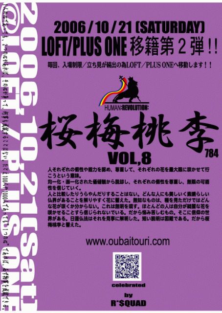 いよいよ☆『桜梅桃李』VOL,8☆ 箱をネイキッドロフトからロフトプラスワンへ移動して2回目☆ 前回も満員御礼でした!!有難うございます☆ イベントの模様は、桜梅桃李オフィシャルサイト http://www.oubaitouri.com に近日中にUP!!しますので、御覧ください♪ 次回10/21(土)のVOL.8☆さらにパワーアップして開催致しますので、是非!!遊びに来て下さい♪ 【日時】2006/10/21(sat)/OPEN-17:30/START-18:30 【会場】 ロフトプラスワン(新宿区歌舞伎町1-14-7林ビル 地下2階) TEL 03-3205-6864 地図