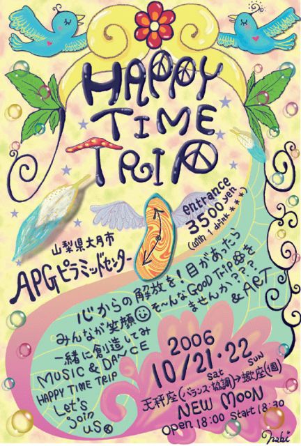 ☆HAPPY TIME TRIP☆ たった一つの尊い命 それぞれの授かった力の素晴らしさを 不安や恐怖から隠されてしまわないように… 心からの解放を!! そして磨いて行こう!! 目があったら みんなが笑顔 そ〜んなGOODTRIP☆を 一緒に創造してみませんか??? MUSIC&DANCE&ART…etc LET’S JOIN US!!!! 日時 2006年 10月21日22日(土・日)新月 場所 APGピラミッドセンター http://www.apg-j.gr.jp アクセス JR 中央線梁川駅下車 徒歩5分