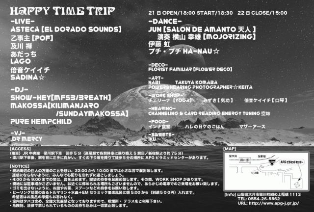 コレは私の友達がおこなうhappyなtripなイベント。 こころからの解放を! 目があったらみんなが笑顔☆ そ〜んなgood tripを一緒に創造しませんか?? ART&MUSIC&DANCE HAPPY TIME TRIP LET'S JOIN US ピース LIVE ASTECA/EL DORADO SOUNDS 乙事主/POF 及川 禅 あだっち LAGO 倍音ケイイチ SADINA DJ SHO=HEI/MFSB/BREATH MAKOSSA/KILIMANJARO PURE HENP CHAILD DANCE HA=HAU JUN 横山幸雄 伊藤虹 などなどが出演します。 その他yo-ga,気功、コウキンなどのワークショップも あります。 寝袋持参で遊びにきて