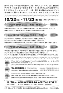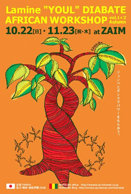 ■■■■■■■■■■■■■■■■■■■ Lamine "YOUL" DIABATE AFRICAN WORKSHOP vol.1 Autumn 10.22[日] at ZAIM 企画:FANKA:http://mixi.jp/view_community.pl?id=1279378 協力:横浜・創造界隈 ZAIM WARA.BA office http://waraba.at.infoseek.co.jp WARA.BA Blog http://uruma.ap.teacup.com/waraba/ ■■■■■■■■■■■■■■■■■■■ 日本にジェンベを広めた第一人者「YOUL(ユール)」と、 ジェンベ馬鹿のハマッ子達によるチーム「FANKA」がお届けする 【アフリカンワークショップ】!!!第1弾のお知