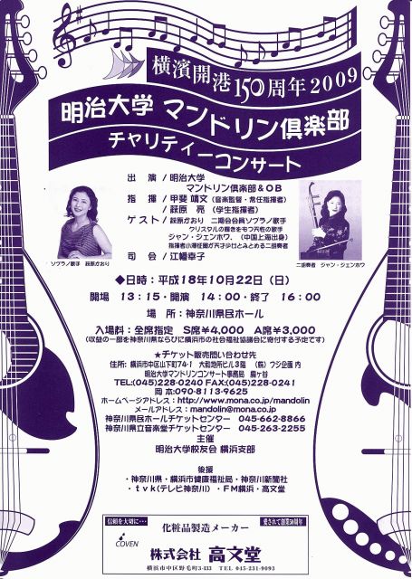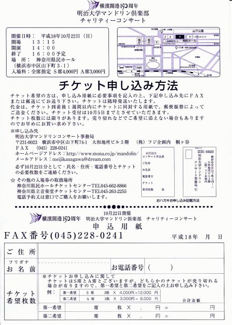 横浜で今年 明治大学マンドリン倶楽部 コンサートが開催されます。 http://www.mona.co.jp/mandolin/ 場所は神奈川県民ホールです。 開場13:15 開演14:00 終了16:00 S席 4000円 A席 3000円 お知り合いにぜひご紹介ください。