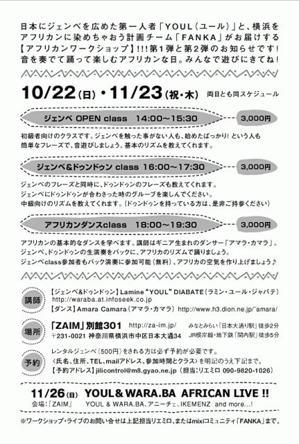 ジェンベを日本に伝えた第一人者 ”YOUL” と ジェンベ馬鹿のハマッ子達によるチームFANKAがお届けする 『アフリカンワークショップ vol.1』が、横浜にて開催されます! 音を奏でて踊って楽しむアフリカンな日。みんなで遊びにきてね! 【日程】10/22(日) 【講師】 ジェンベ:Lamine ’YOUL' DIABATE(ラミン・ユール・ジャバテ) http://waraba.at.infoseek.co.jp ダンス :Amara Camara(アマラ・カマラ) http://www.h3.dion.ne.jp/~amara/ ◆ジェンベ OPEN clas