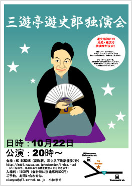 三遊亭遊史郎師匠独演会を、師匠の地元の横浜で行うことになりました。 日にち:10月22日(日) 時間:20時から途中休憩を挟み、2席の予定 場所:反町駅、三ツ沢下町駅から徒歩7分のところにある、 NO BORDERというお店。 http://web1.nazca.co.jp/noborder/index.html 入場料(木戸銭):1500円(別途チャージ料500円がかかります) アットホームなバーで、のんびり落語を聴きましょう☆彡 当日は、イラストレーションとの初のコラボがあったり、 ちょっとしたお土産もご用意する予定です。 お誘い合わせの上、是非いらしてくだ