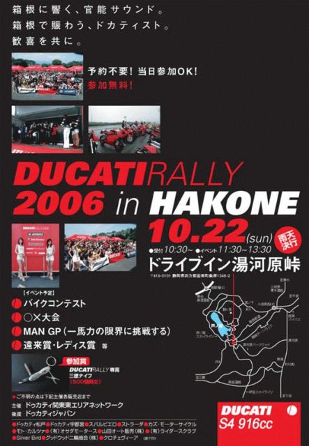 来たる22日にドライブイン湯ヶ原峠にてドカラリ開催です♪ 受付時間 10時30分 イベント 11時30分〜13時30分 雨天決行!! 参加賞でDUCATI RALLY専用 三徳ナイフが(500個限定)もらえます(〃^∇^) 僕は今回 参加を考えています♪ S4乗りの皆さんの中でも参加を考えている方いらっしゃるでしょうか? 参加者いれば是非、現地でお会いしたいと思っています∈^0^∋