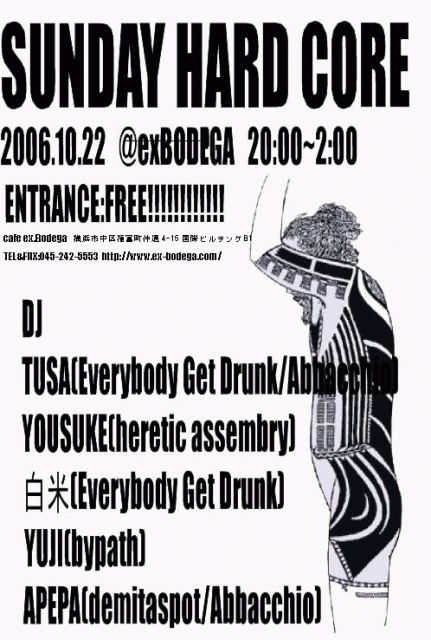 2年ぶり!!!!!夢の企画。遂に復活!!!!! SUNDAY HARDCORE 2006.10.22 @exBODEGA 20:00〜2:00 ENTRANCE:FREE!!!! DJ TUSA(Everybody Get Drunk/Abbacchio) YOUSUKE(Heretic Assembry) 白米(Everybody Get Drunk) YUJI(bypath) APEPA(demitaspot/Abbacchio)
