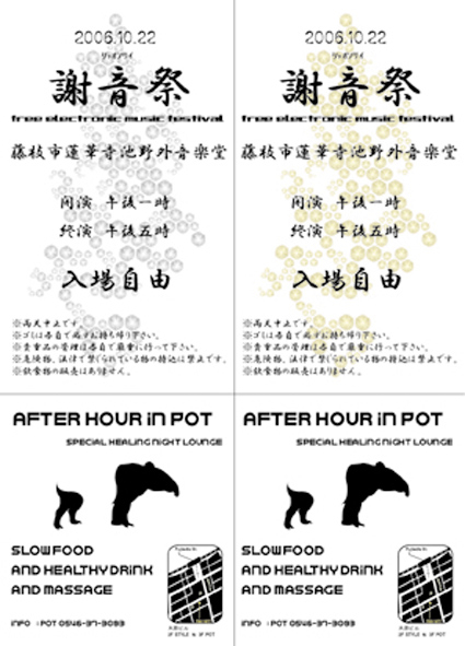 管理人さん失礼します。 2006 / 10 / 22 (日) 藤枝市蓮華寺池公園 野外音楽堂 Ticket FEE : Free♪♪ start 13:00〜 finish 17:00 DJ ----------------------------- 13:00 〜 wura 14:00 〜 katsumix 15:00 〜 mannen 16:00 〜 klark kent *雨天中止 遊びに来て下さい。