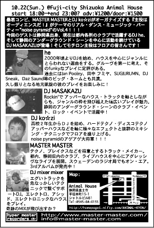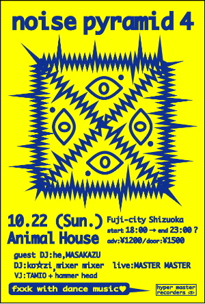 start/18:00 adv:¥1200+1d/door:¥1500+1d guest DJ:he,MASAKAZU DJ:ko☆zi,mixer mixer live:MASTER MASTER 暴君コンビ、MASTER MASTERとDJ ko☆ziがオーガナイズする『主役はオーディエンスだ!』がテーマのリアル・ダンス・ミュージック・パーティー"noise pyramid"のVol.4!!! 今回のゲストは静岡県出身、現在は都内各所のクラブで活躍するDJ he、そして静岡のアンダーグラウンド・シーンを中心に活動を続けているDJ MASAKAZUが登場! そしてモチロン主役はフロアの皆さんです!