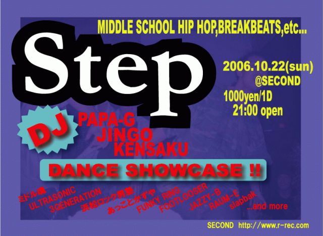「STEP」@SECOND MIDDLE SCHOOL HIP HOP,BREAKBEATS,etc... 2006.10.22(sun) 21:00 OPEN 1000yen/1D 「DJ」 PAPA−G JINGO KENSAKU 「DANCE」 ミドル魂 ULTRASONIC 3GENERATION 浜松ロック男塾 あっことかずや FUNKY RING FOOTLOOSER JAZZY−B RAUM−E SLAPBAK ・・・and more http://www.r-rec.com/2/