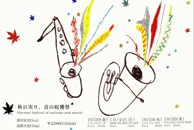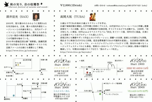 10月20日(金)〜25日(水)、元渋さ知らズ・高岡大祐(TUBA)×深井宣光(SAX)LIVE決定!! あの感動が再び!!!!!なんちって。 ※21日を除く。 http://www.bloc.jp/nobusax/ 「秋の実り、音の収穫祭〜Harvest festival of autumn and sound」 ●10/20(金) メロメロポッチ 20時スタート/¥2000(1DRINK付き) 920-0904 金沢市下近江町68武蔵ビル地下 TEL/FAX:076-234-5556 ●10/22(日) Here we are! 45 cafe 19時スタート/¥2000(1DRINK付き) 富山市呉羽町6927-29 076-436-6249 ●10/24(火) じ