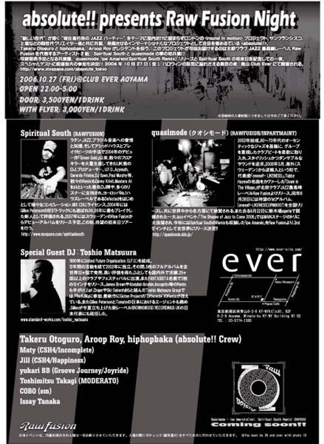 FLOWER RECORDSきっての大御所バンド、Sunaga t experienceと Little Big Beeが、ついに夢の競演!!欧州ハードバップやモードの エッセンスを抽出し、オーソドックスさやエモーションを解体させ更新、新たなフロアジャズを再構築するスタイルで突き進む年内最後のラ イブ演奏Sunaga t experienceに対し、Little Big Bee は オリジナル・メンバーに加え、トランペット、パーカッションの西岡ヒデローにより繰り広げられる「クラブで行うためのライヴ」で応戦!!見逃し厳禁!!