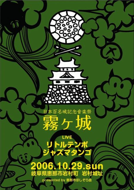 美濃岩村城 日本名城百選選定記念音楽祭「霧ヶ城」開催決定! 800年の歴史をほぼそのまま残す日本最高峰の山城「美濃岩村城」本丸跡にて第1回日本名城百選選定記念音楽祭「霧ヶ城」開催決定。 メインLIVEはジャパニーズダブ界の雄、世界にも類のないカリビアンダブバンドLITTLE TEMPO!紅葉の中スチールパンが山々に反響、町中に響き渡ります。 さらにおなじみの「JAZZマタンゴ」も参戦! チケットは限定500。急げ! 10月29日(日)午前11時スタート 前売3000円 当日3500円 当日小学生未満 無料 当日小、中、高