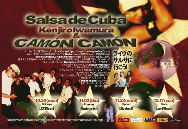 『岩村健二郎&カモンカモン』は、Salsa Swingoza、Grupo Chévere等で活動するヴォーカリスト私岩村健二郎が、完全ダンス志向のキューバン・サルサ・バンドとして2006年春に結成しました。キューバのトップバンドBamboleoに10年間在籍したグルーヴ・マスター、ルドウィグ・ヌネェスをドラムに、