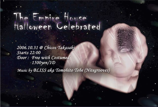 2006/10/31(Tue) @ 高崎Chicos Open: 22:00 Door: 1500yen/1D Music: BLISS aka Tomohito Tobe Info: CHICOS 29 Renjakucho #Nichieido BLDG. B1 Takasaki, Gunma TEL: 027-321-8477
