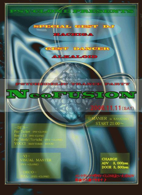 日程:2006年11/11(土) 場所:MANIER START:21:00〜 TITLE −−−NEO FUSION−−− −GEST DJ− HACHIGA(融合-FUSION-) 疾走感溢れるPSYCHEDELIC TRANCEを完璧なEQ使いで次々と繋いでいく完全実力派DJ。どんな時間帯でも適応できるオールラウンドプレイヤーでもある。2003年7月に「融合-FUSION-」を立ち上げ、脅威の集客と盛り上がりで、誰もが認める平日最大級のマンスリーパーティーにまで成長させた。国内外からゲストを積極的にブッキングし過去に「AMI、RYO、MITSUM