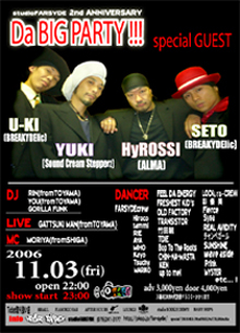 studio FAR-SYDE 2ND ANIVERSARY 「Da BIG PARTY!!!」 11/03(FRI) @8hall open 22:00 SHOW START 23:00 ☆SPECIAL GUEST UNIT☆ YUKI (from SoundCreamSteppers) HyROSSI (from ALMA) SETO (from BREAKYDElic) U−KI (from BREAKYDElic) 【DANCER】 FAR-SYDE CREW 「・tammi ・Hiroco ・MIHO ・AYA ・RIE ・KAYO ・tsuchy ・MARIKO」 FEEL DA ENERGY FRESHEST KIDS(富山) OLD FACTORY TRANSISTOR 竹田組 TDIE