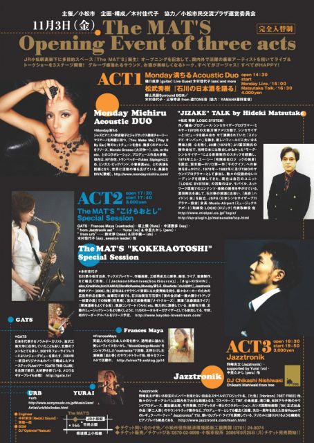 石川県小松市で下記イベントを行います。 出演者たちが今、エプタ3Fで日々レコーディング中。 東京からもじゃんじゃん参加しましょう。 海外からも来ますよ! 石川に知り合いがいたら告知願います。 マンデイ満ちるライブ & 松武秀樹トーク http://ap0.pia.co.jp/pia/et/onsale/ons_event_list.jsp TheMAT'SこけらおとしSpecialSession http://ap0.pia.co.jp/pia/et/onsale/ons_event_list.jsp Jazztronik http://ap0.pia.co.jp/pia/et/onsale/ons_perform_list_et.jsp?ons_search_mode=ON&ONS_COL_SHEET_NO=15