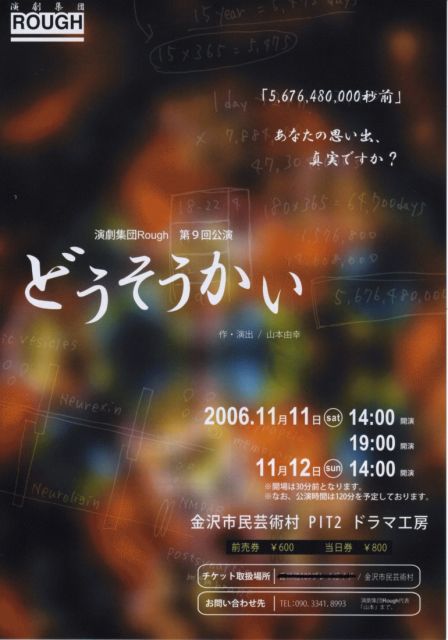 演劇集団ROUGH 第9回公演 「どうそうかい」 作・演出 山本由幸 結婚式の披露宴で同じテーブルになった5人の開いた、 小さな同窓会。しかし、そこで語られる思い出によって、5人は自分の記憶に翻弄されることになる・・・。 「あなたの思い出、真実ですか?」 会場:金沢市民芸術村ドラマ工房(PIT2) 日時:11月11日(土) 開場 13:30(1回目) 開演 14:00 開場 18:30(2回目) 開演 19:00 11月12日(日) 開場 13:30(3回目) 開演 1