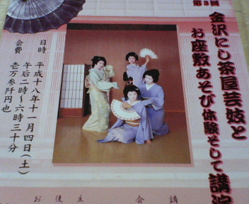 日時 11月4日 午後2時〜6時半 会場 西料亭組合検番 浅乃家 西泉家 はん家 美音 明月 華の宿 にし料理茶屋 講師 宇佐美 孝(金沢市立多摩川図書館近世史料館館長) 会費 13000円 お申し込みは 西料亭組合 076−241−0257(土日は休み) もしくはこのトピックに書き込んでくださいませ