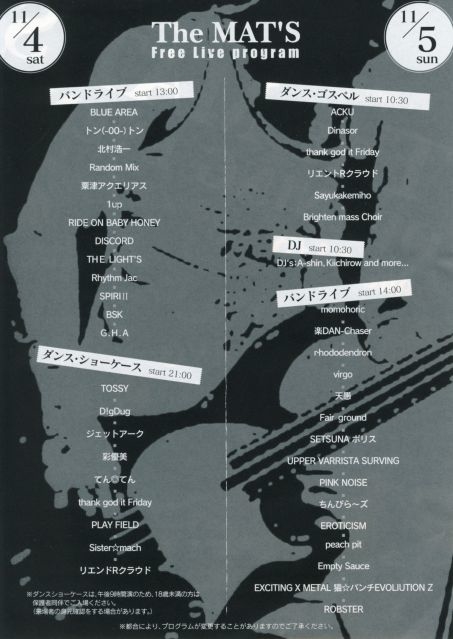 AZ YOU LIVE November 2006.11.19(Sun) 金沢AZ OPEN 14:00 START 14:30 前売り:¥1,000 出演バンド THINSEA DALES CLAP MANIA 紅葉〜kreha〜 浮世 JAM CREEP ねずみ小僧(名古屋) tomato color 問合せ 金沢AZ 076-264-2008
