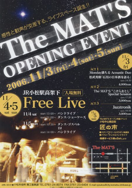 3日間に渡るイベントの最終日に出演します。 出演予定日時は11月5日19時30分から30分間の予定。 近隣の方のみならず遠方の方も是非我らの勇姿を見にきてください。 尚、ライヴの模様は後日ピーチピットブログ内で公開する予定です。 お楽しみに。 theMatsオープニングイベント http://www.city.komatsu.ishikawa.jp/kakuka/syouko/puraza/Matsopening.asp