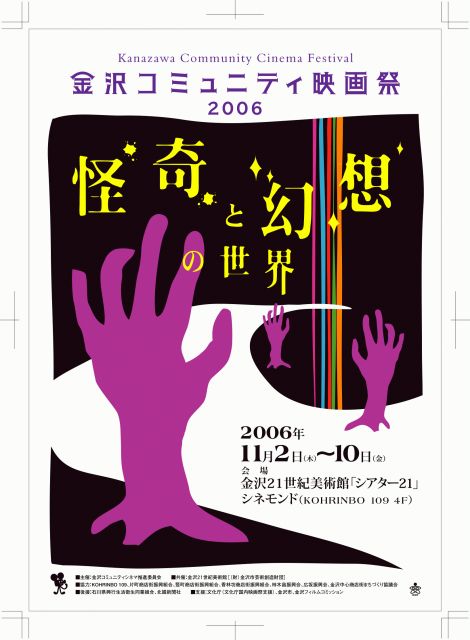 今年もやります金沢コミュニティ映画祭2006 今年のテーマは「怪奇と幻想の世界」! 怖い映画から笑える映画、美しい映画など全35本上映! ★黒沢清『LOFT』 2005年/日本/監督: 黒沢清 トークゲスト:黒沢清+高橋洋! 黒沢清と高橋洋が怪奇恐怖映画について1時間半語る ★カール・ドライヤーの世界 『吸血鬼』 Vampyl 1931年/ドイツ・フランス/監督: カール・テホ・ドライヤー 『奇跡』 Ordet 1955年/ベルギー・デンマーク/監督: カール・テホ・ドライヤー ★日本の怪奇幻想映画