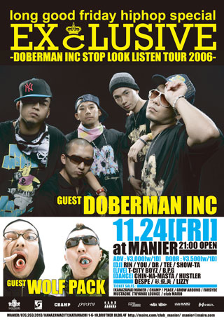 11/24(FRI) EXCLUSIVE @金沢MANIER OPEN/21:00 ADV/3000YEN(1D) DOOR\3500YEN(1D) GUEST/DOBERMAN INC,WOLF PACK LIVE/T-CITY BOYZ,D.P.G DJ/RIN,YOU,DR,TEE,SHOW-TA DANCE/CHIN-NA-MASTA,HUSTLER,DESPE,彩優美,LIZZY